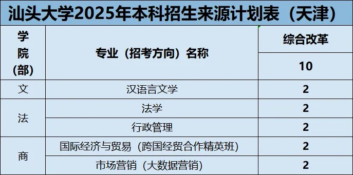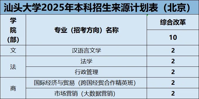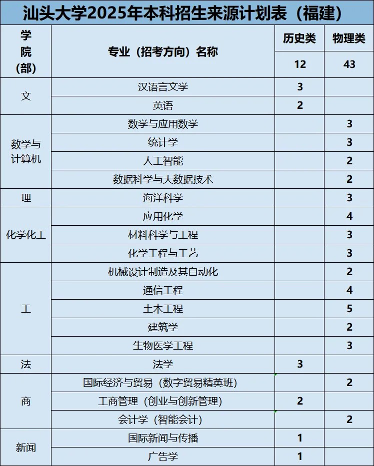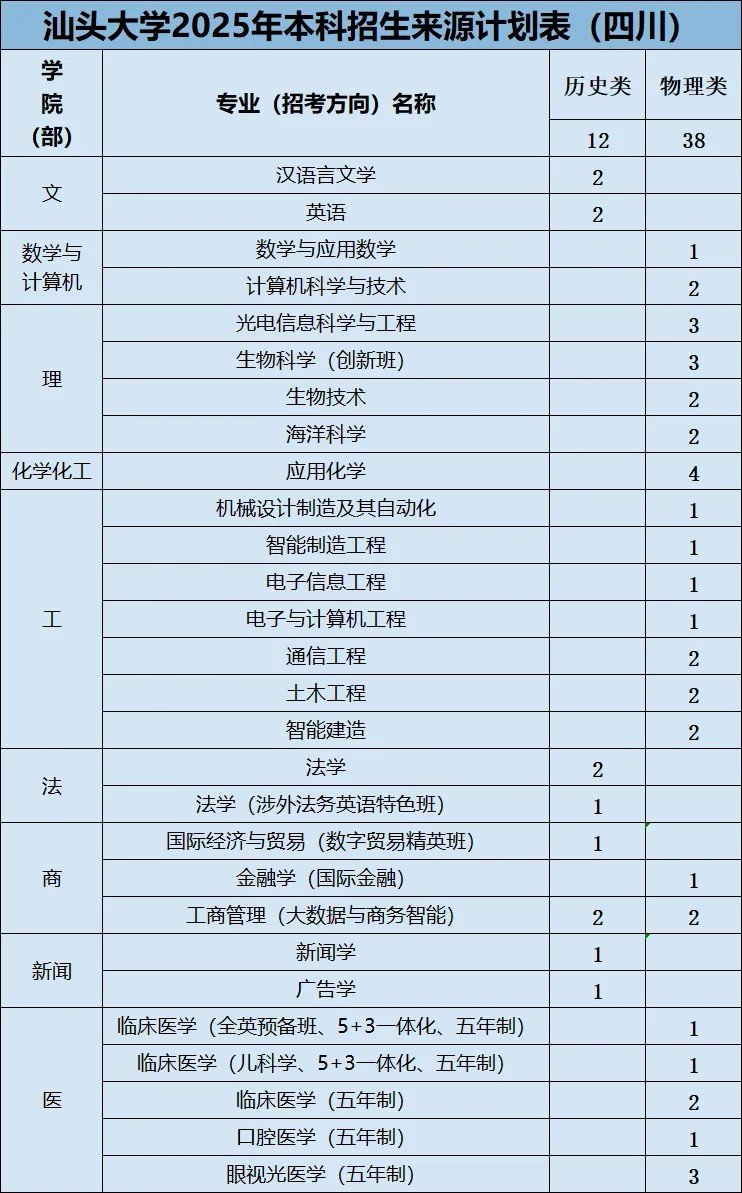 2025年,汕头大学进一步优化学科专业布局和招生专业安排,今年安排本科招生专业56个,其中,新增招生专业7个,国家级或省级一流本科专业建设点30个。另外,新增专业招生方向13个。