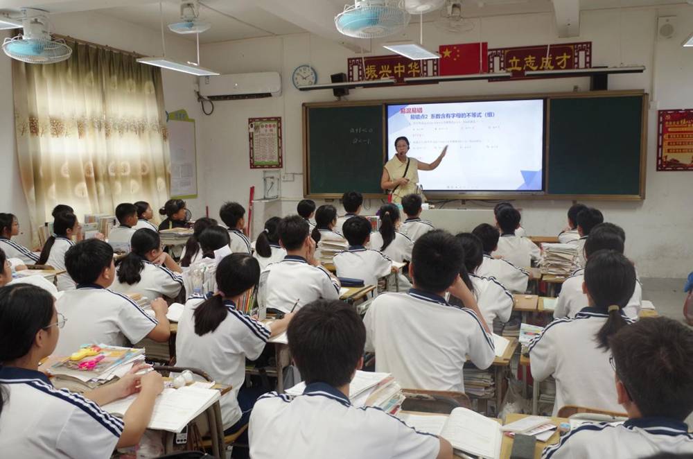图为韦洁华老师在廉江七中七年级2班开展“含参数不等式组解法大通关”示范课