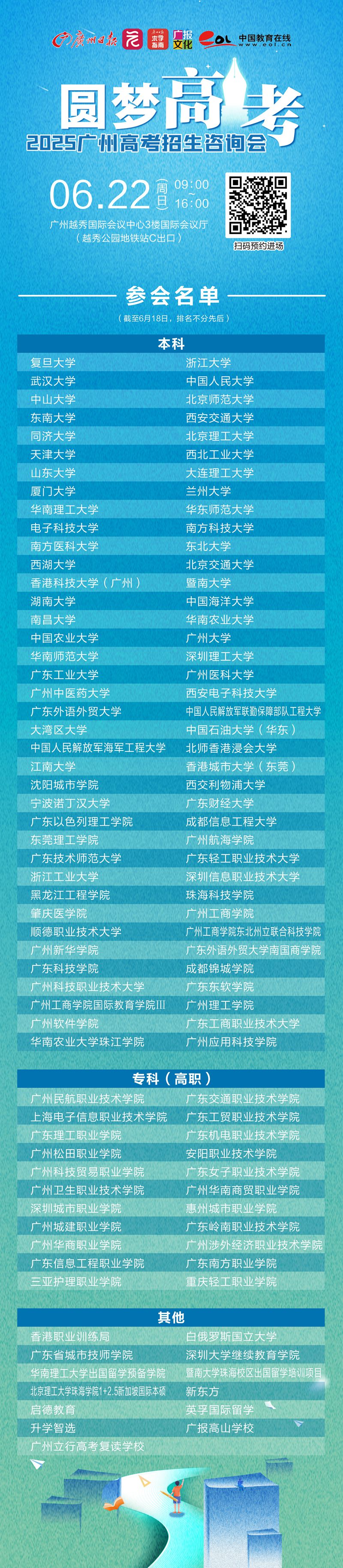 为响应社会需求, 2025广州高考招生咨询会将于6月22日9时—16时在广州越秀国际会议中心3楼国际会议厅举行。超100所省内外高校准时集结,10所高校现场宣讲,举办方同时派发200张志愿卡,共同公益助力科学填报高考志愿。