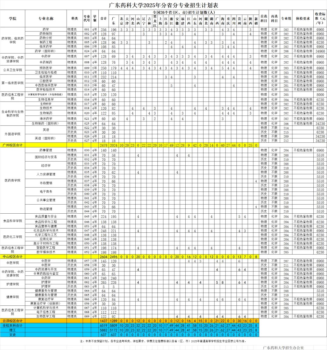 2025年广东药科大学普通本科招生计划6800人。其中省内招生6022人(含订单定向医学生213人),省外招生710人,预留计划68人。2025年省外生源来自北京、上海、天津、江苏、浙江、黑龙江、辽宁、吉林、山东、山西、河南、河北、安徽、江西、福建、湖南、湖北、重庆、四川、海南、广西、陕西、贵州、云南、新疆等25个省(直辖市、自治区),其中,2025年学校首次在新疆维吾尔自治区招生。