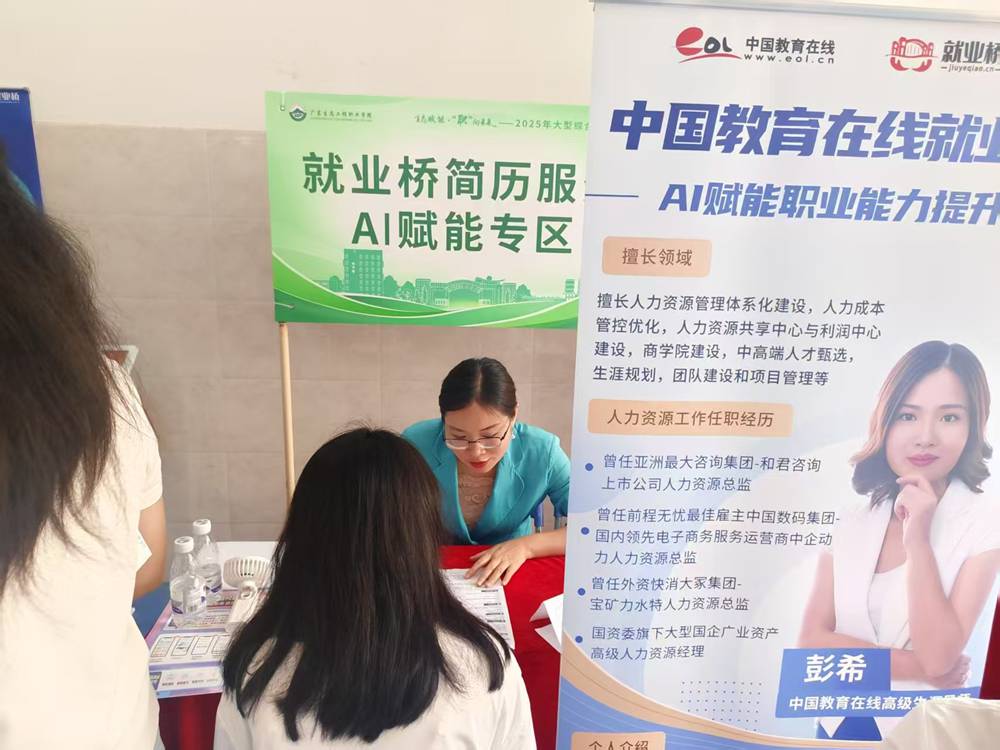 2025年5月10日,广东生态工程职业学院联合中国教育在线就业桥平台成功举办【生态赋能"职"向未来】2025届大型综合类招聘会。为提升毕业生就业服务质量,主办方特别设置了人工智能简历打印一体机服务体验区,并邀请中国教育在线高级生涯规划导师彭希为参会学生提供专业指导。