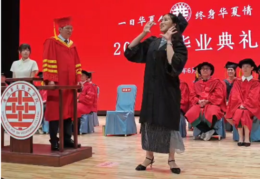 典礼上,一名毕业生结合专业所长,自编了一段融合中华传统礼仪的舞蹈,面向校长庄重地行了三次鞠躬作揖之礼表达感恩之情,校长也俯身拱手,郑重回礼,引发现场师生热烈鼓掌。