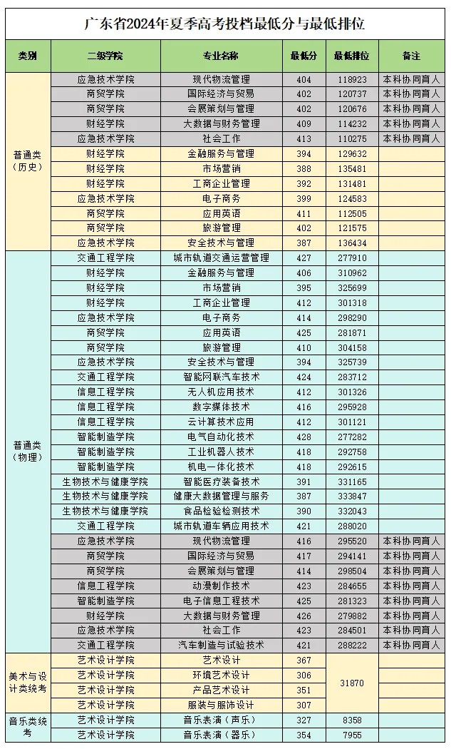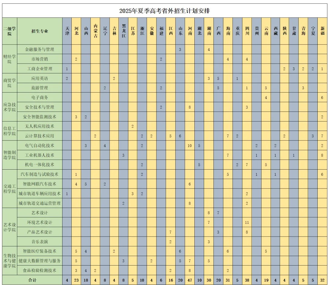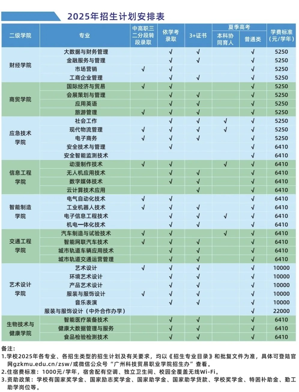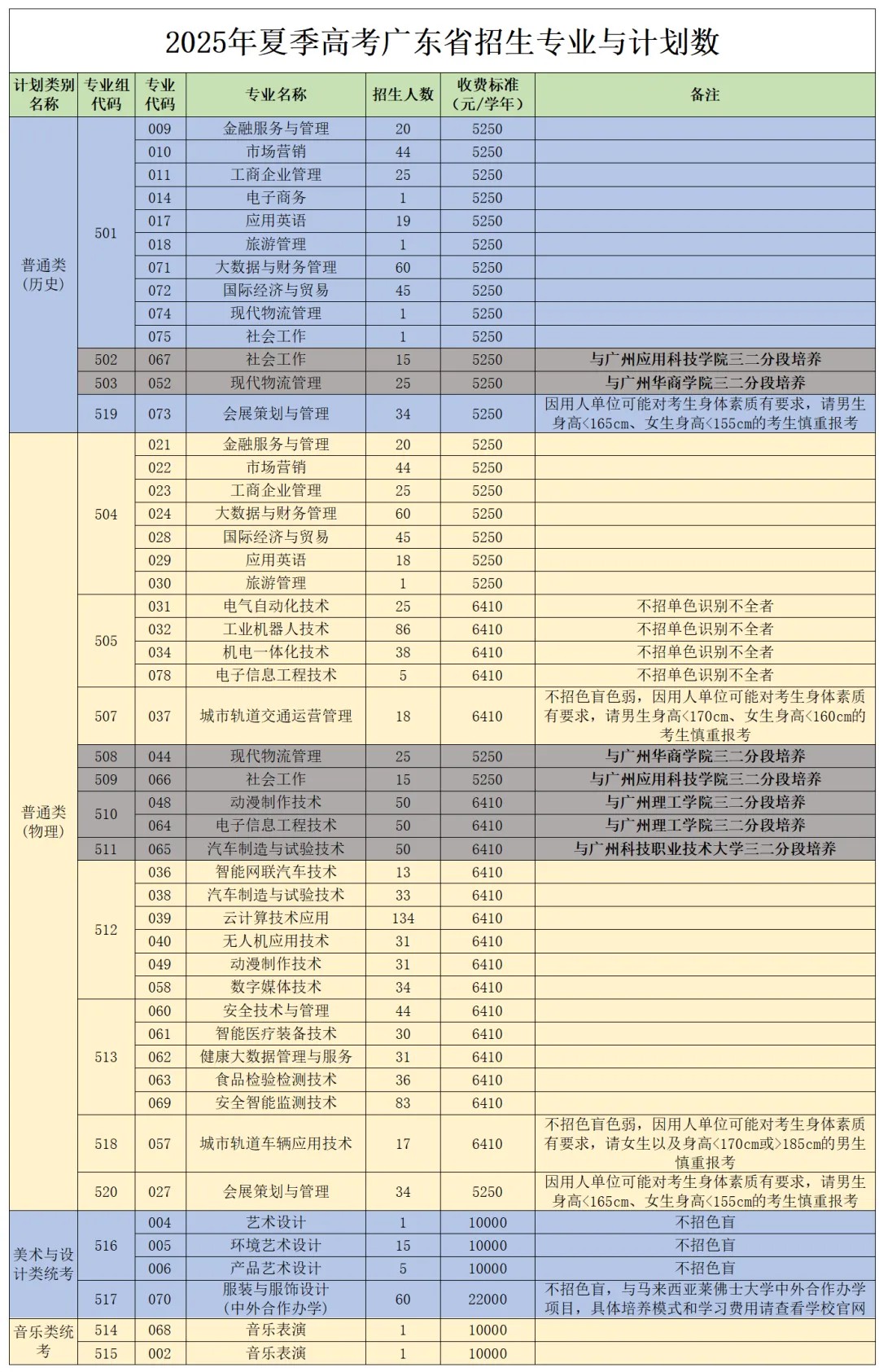 学校2025年夏季高考招生计划1888人,33个招生专业面向全国29个省(自治区、直辖市)招生。其中广东省招生计划1500人(普通类1270人,本科协同育人三二分段230人),外省计划338人。