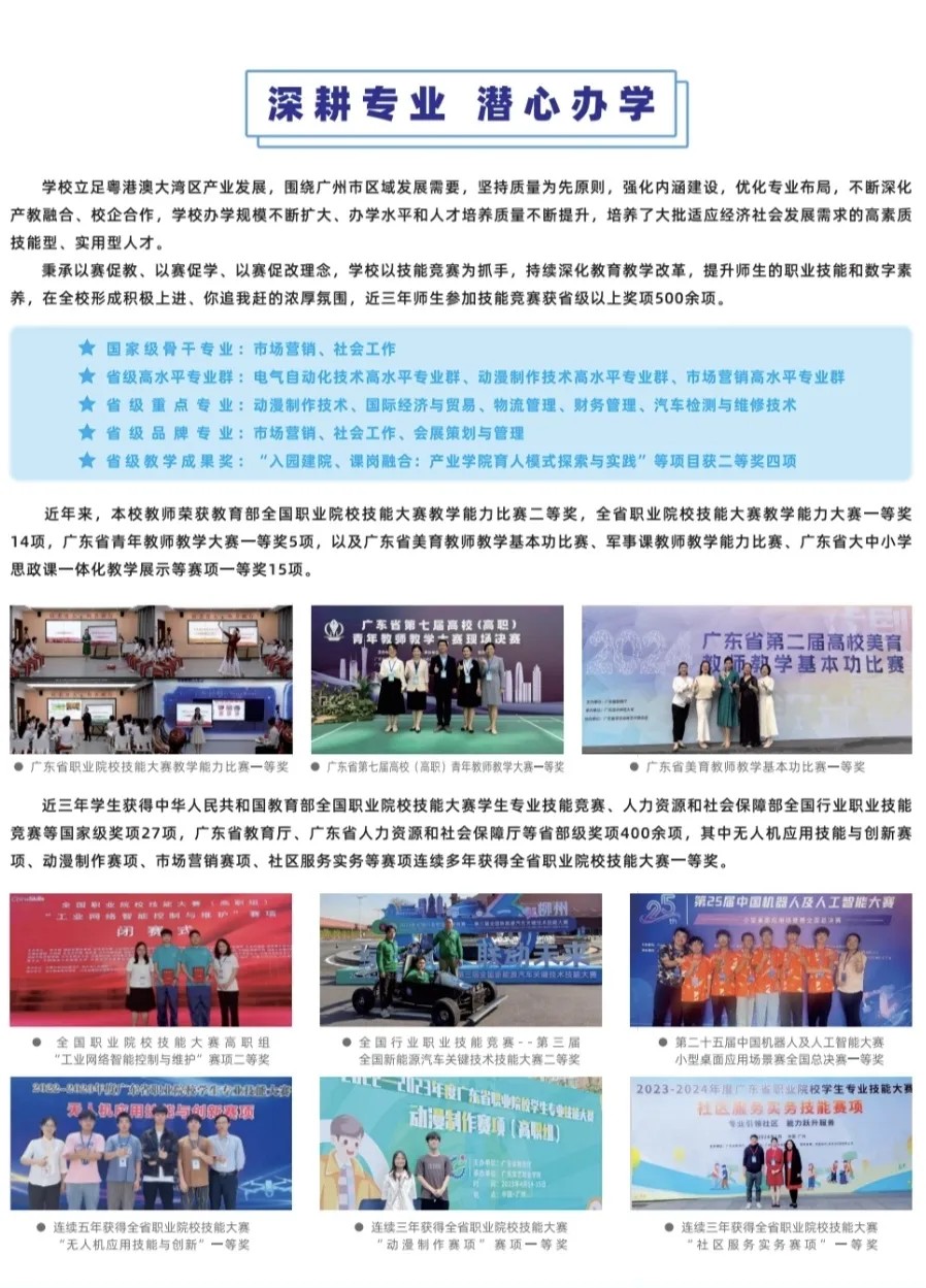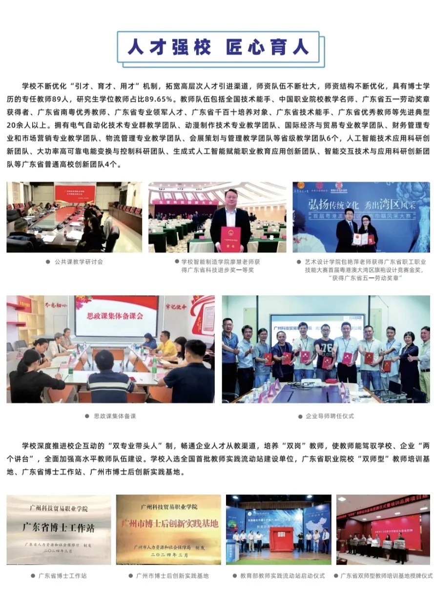 学校地处粤港澳大湾区核心城市—广州,地理位置优越,校园环境优美。学校秉承“质量立校、人才强校、特色兴校、服务荣校”的办学理念,遵循“厚德、砺学、修技、至善”的校训,立足于服务广州市及粤港澳大湾区科技与商贸两大板块,以番禺校区(毗邻广州大学城)为中心,北进广州开发区、南拓南沙自贸区,形成“一体两翼”发展格局。学校有全日制在校生12000余人,开设12个二级学院,8大专业群,共33个专业,其中国家级重点专业6个、省级重点建设专业16个、省级高水平专业群3个。现有教职工600多人,专任教师中具硕士及以上学位者比例达80%,具有高级职称150人。
