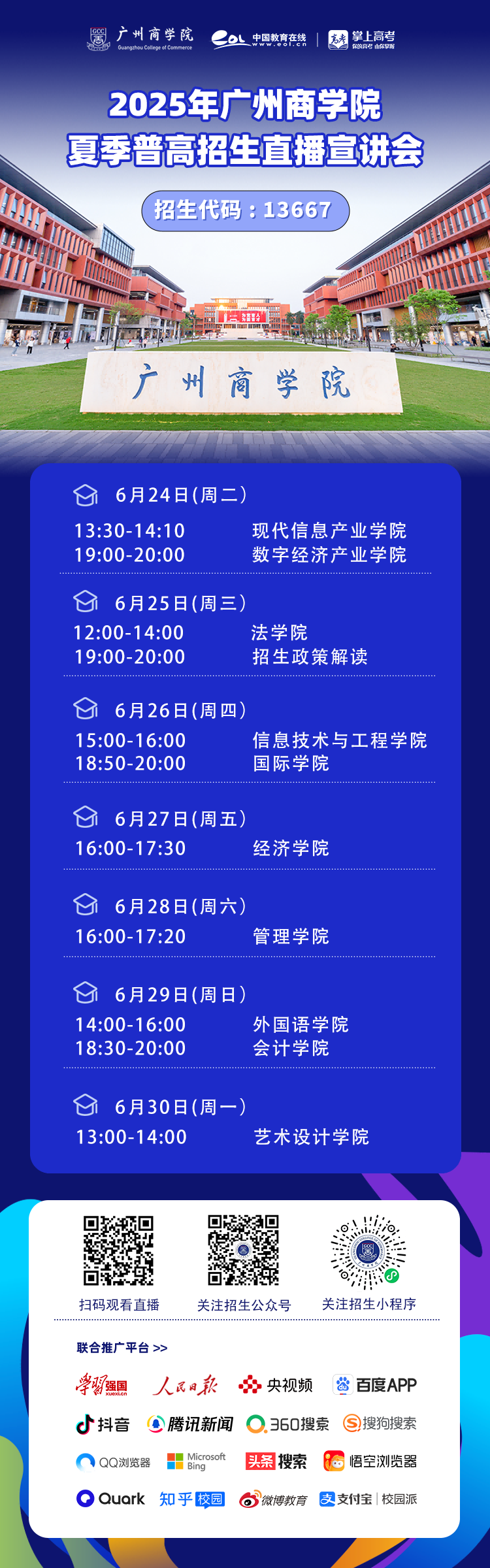 广州商学院位于粤港澳大湾区东北部,坐落在“中新广州知识城“的南部核心地带,前身是华南师范大学增城学院。1999年招收第一批学生,是广东省第一所新机制二级学院、全国第一批独立学院;2011年获得学士学位授予权;2014年成为广东省第一所由独立学院转设的普通本科高校;2020年顺利通过教育部本科教学工作合格评估;2021年成为广东省第一批民办高校硕士学位立项建设单位;2023年获批为国家自然科学基金依托单位。