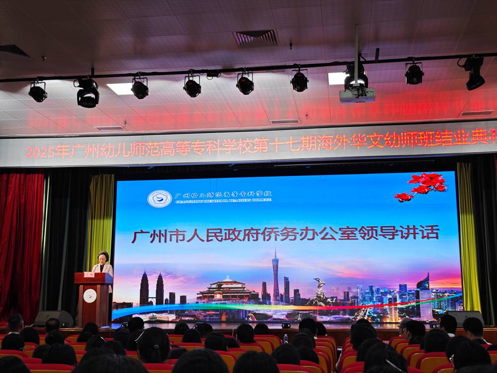 典礼现场,广州市人民政府侨务办公室主任江帆高度肯定海外华文幼师培训班并对圆满完成学业的学员们表达了热烈的祝贺。江帆主任在发言中对学员们提出三点希望:一是希望学员们做华文幼教事业的践行者,始终保持一颗好奇心和强烈的求知欲,不断提高自身能力素质,努力把自己锻造成一名优秀的华文幼教工作者。二是希望学员做中华优秀文化的传播者。让更多孩子感受中华文化的独特魅力。三是希望学员做促进所在国人民和中国人民友好交往的使者。进一步增进两国人民的交流和理解,为促进两国民间友好交往贡献青春力量。期望未来广州幼专继续发挥百年师范教育传统和特色专业优势,以更高的站位、更宽的视野、更实的举措,推动海外华文教育高质量发展,为促进中外文化交流互鉴作出新的更大贡献。