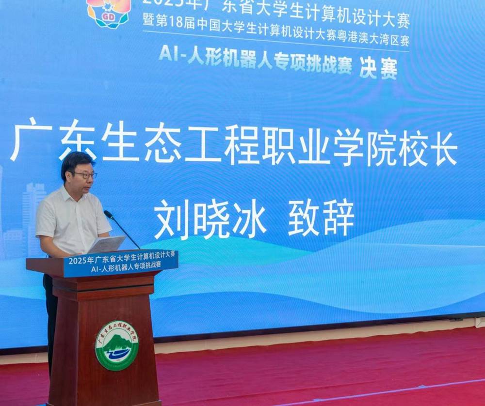 开幕式上,广东生态工程职业学院校长刘晓冰发表致辞。他指出,人形机器人作为新质生产力的典型代表,正在推动产业升级和社会变革。本次大赛以"激发创新、培养技能、促进合作、展示风采"为宗旨,不仅为大学生搭建了实践创新的平台,更促进了人工智能教育领域的交流与合作。学校将全力做好赛事保障工作,确保比赛公平有序进行。