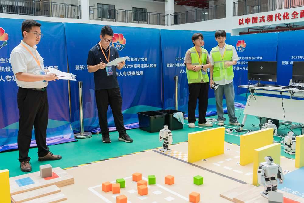 最后裁判长和参赛选手代表进行了宣誓,文震副校长宣布:2025年广东省大学生计算机设计大赛暨第18届中国大学生计算机设计大赛粤港澳大湾区赛——AI-人形机器人专项挑战赛决赛开幕。