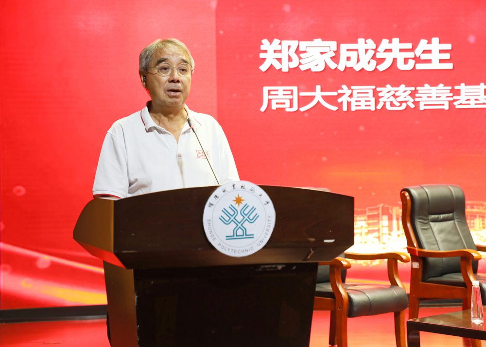 郑家成高度评价顺德职业技术大学优美的校园环境,称其为“理想的读书学习之地”,并充分肯定学校取得的一系列办学成果,祝贺学校成功申办职业本科大学。他勉励莘莘学子要珍惜优越环境和宝贵机会,专注学业、精研技能,掌握一技之长,成就出彩人生;要善于拓展校友等人脉资源,编织更宽广的社会网络;要注重品德修养,诚信做人、认真做事。郑家成强调,行行出状元,无论起点高低,只要脚踏实地、精进所长,皆可取得优异成绩、成功成才,既提升个人价值,也为母校赢得声誉,为国家作出贡献。