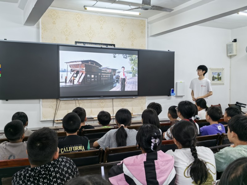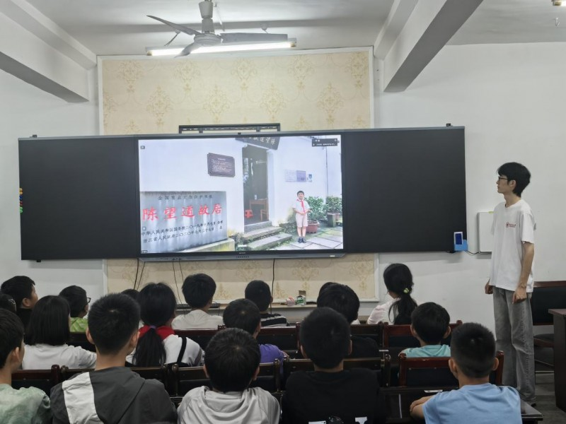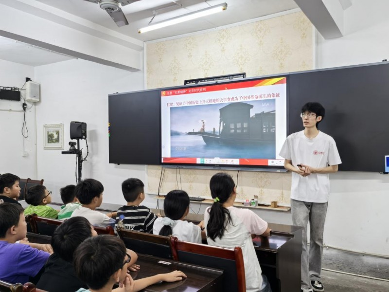 “同学们,你们知道红船精神中的红船指的是什么吗?红船背后又有哪些故事呢?……”炎炎夏日,永和镇第一小学的教室里,浙江理工大学研支团成员周子贺正为小小铁道兵讲解员们带来一场别开生面的红色文化课堂。