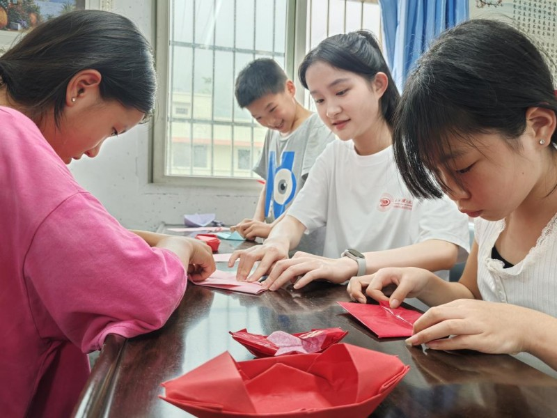 镜头拉回教室,浙江理工大学研支团成员庄萧雅展开一张红纸,指尖在纸面压出清晰的折痕:“同学们看,先沿中线对折,船头要像破浪的海燕一样扬起——这是当年共产党人在风雨中开拓新路的勇气。”四十双小手捏着红纸上下翻飞,彝族少年们指尖的褶皱在桌面上投下颤动的光影,彩纸摩擦声像极了南湖浪涛的细语。