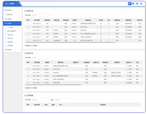 ★ 个人一张表:教学服务门户整合师生在校的各类数据,形成教师、学生一张表。教师可查阅个人课表、历年任课信息、教学成果、教研教改、教师发展等信息;学生可查阅学籍信息、个人课表、成绩、论文、学生评教、学科竞赛、各类奖项等信息,师生发展一目了然。