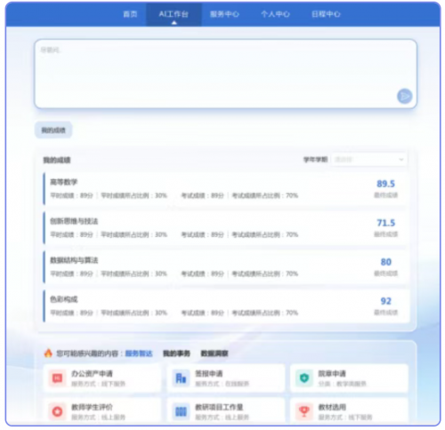 构建智能高效的全场景数智教学服务门户,实现从“服务分散”向“聚合感知”的跃迁。围绕“统一入口+智能交互+多端响应”,将教学业务流程、师生服务事项等深度融合于一个智慧服务生态中。