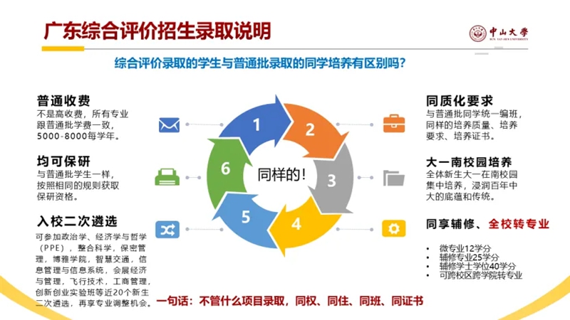 综合评价录取的考生,培养质量及要求、转专业、学费、证书等同普通批录取的考生一致。同学们进入中大学习后,拥有各种转专业、辅修、读研、二次遴选等学习方式,全校各校区院系的专业都提供了让你跨学科学习的机会。