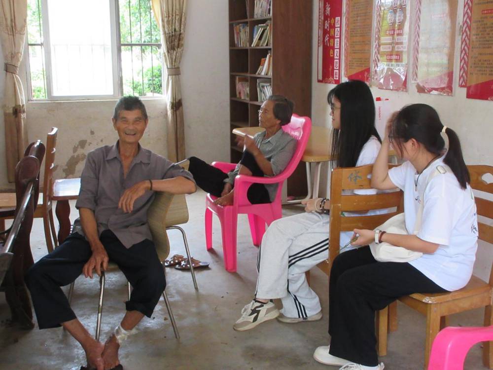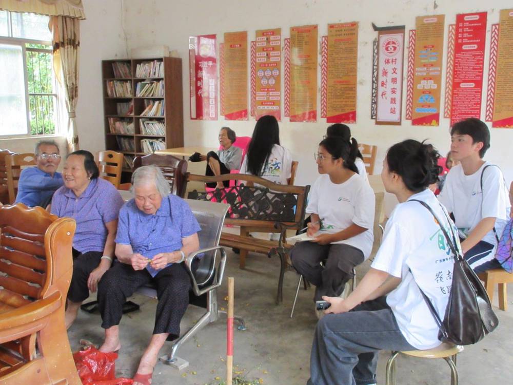 岭南师范学院“飞跃鹰隼突击队”队员们与村里的老人们聊天 蔡锦儿 摄
