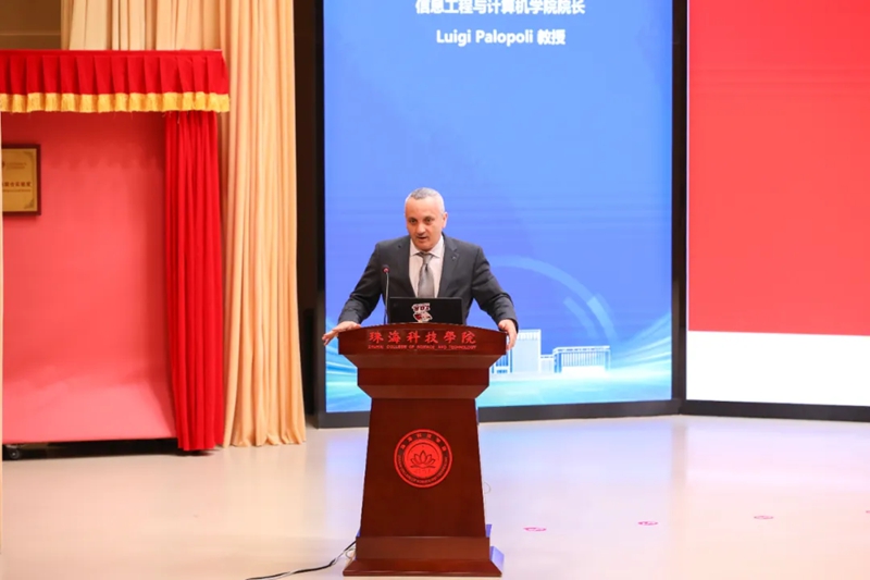 欧洲科学院院士、意大利特伦托大学信息工程与计算机学院Fausto Giunchiglia教授,意大利特伦托大学信息工程与计算机学院院长Luigi Palopoli教授、信息工程与计算机学院博士后Matteo Busso,珠海市科技创新局党组成员、副局长、二级调研员戴舸,珠海市外事局副局长张挺,珠海科技学院党委书记、理事长廖立国教授,党委副书记、校长刘鸣教授,党委委员、副校长程春梅教授,珠海迈科智能科技股份有限公司董事长缪克良,珠海科技学院计算机学院党委书记、院长梁艳春教授,计算机学院常务副院长刘衍珩教授,科研处处长赵成国教授,国际交流与合作处处长董燕教授到场参加仪式。仪式由程春梅主持。