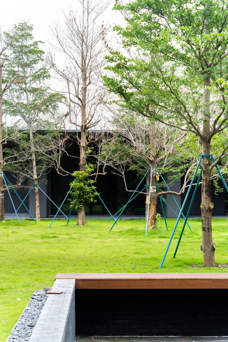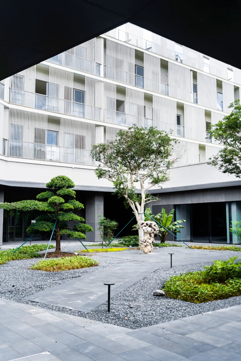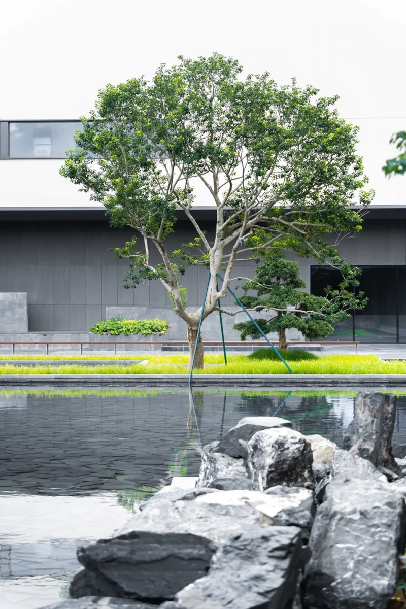 国际交流中心位于校门旁,采用社会&校园的双门厅设计,方便进行大型演出等相关活动,走进内部则别有洞天,东方园林的禅意和山湖绿意自然融合,整个氛围幽静而隐秘。