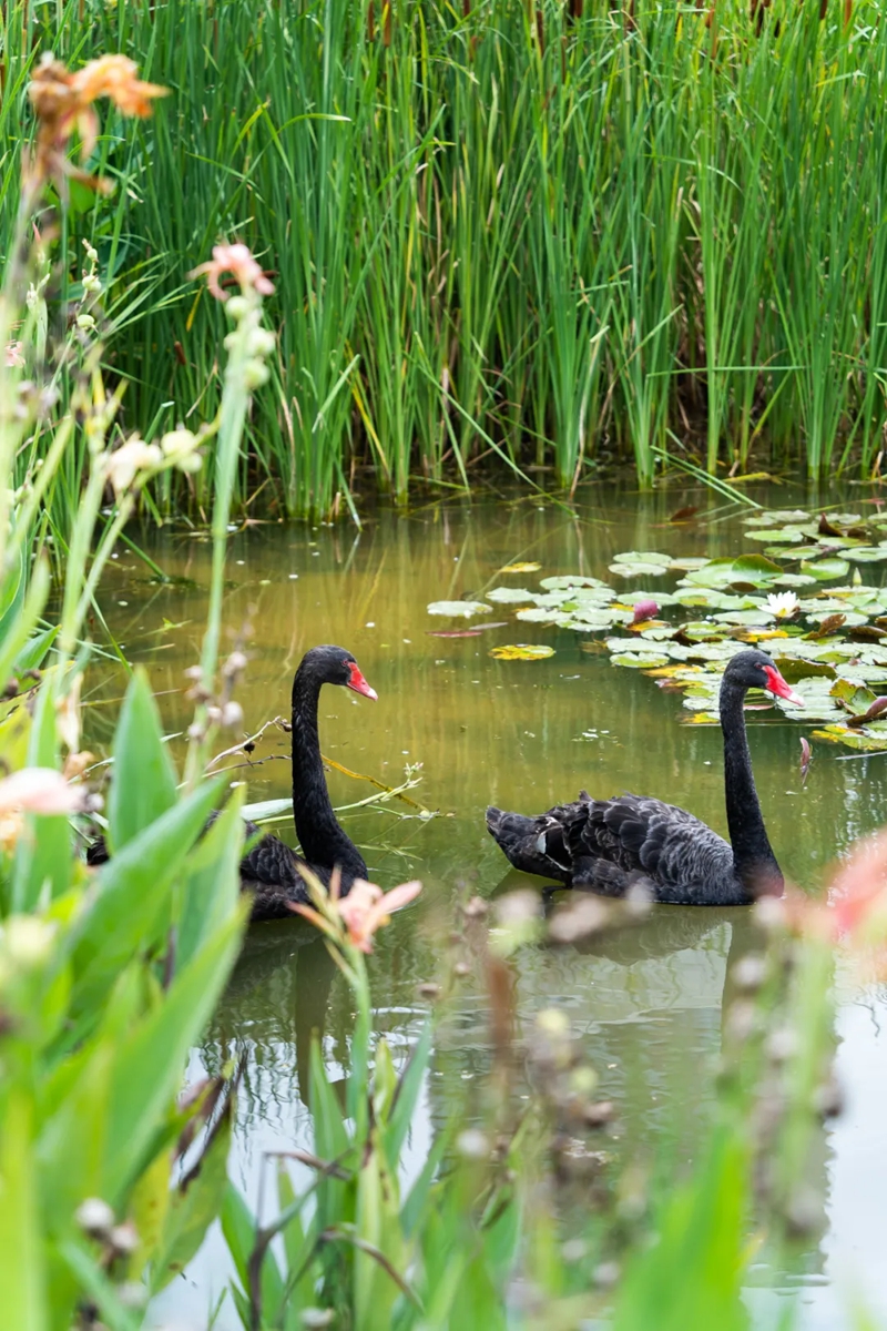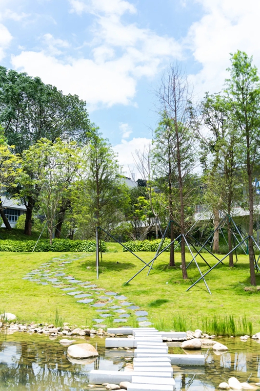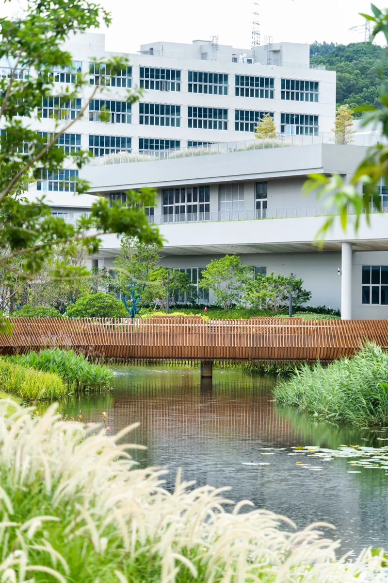 学校主体建筑大致围绕着中央湖公园而建,湖边水草丰茂,流水潺潺,还能看见黑天鹅、水鸟的身影,如同来到一片生机盎然的森林秘境。