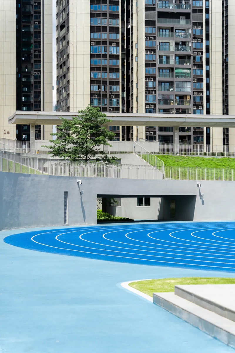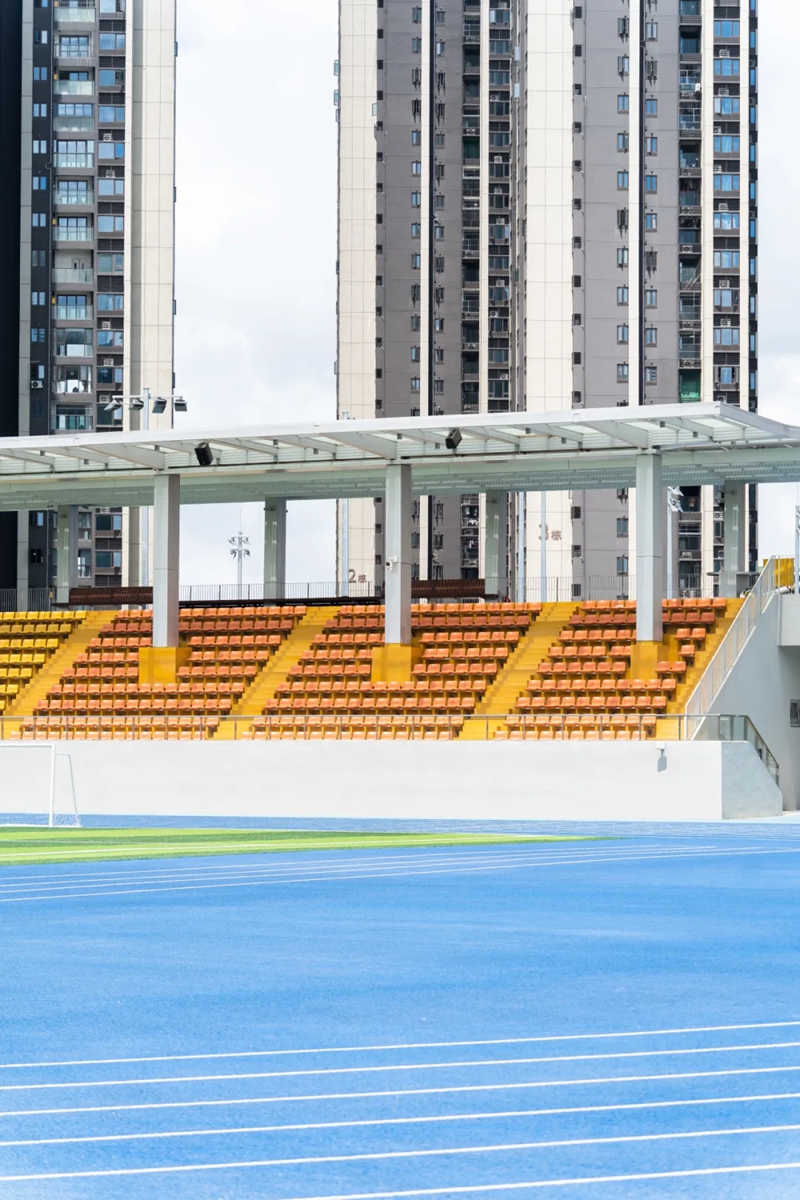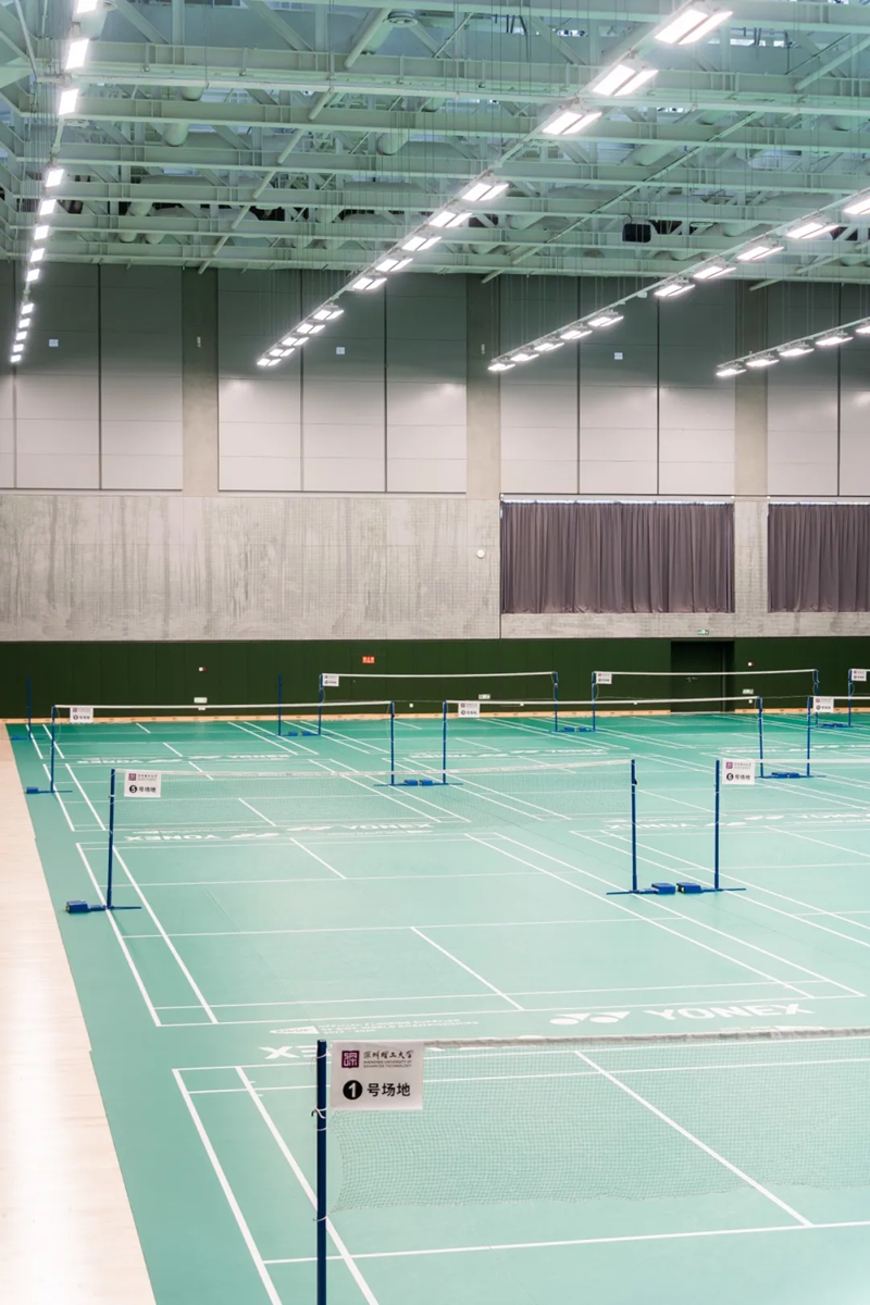 体育馆位于湖边,看上去像一艘颇具未来感的飞船,色调以灰黑为主,气势磅礴,一旁就是室内羽毛球场和操场等体育设施,都是学生们运动锻炼、挥洒汗水的好去处。