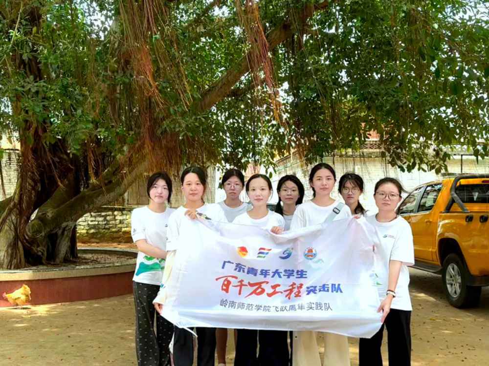 岭南师范学院飞跃鹰隼突击队队员在体村村委会树下合照 蔡芝琳 摄
