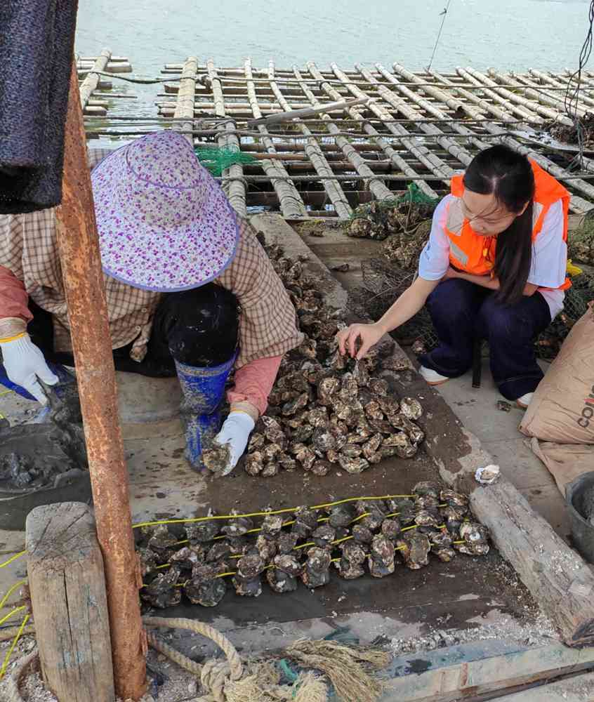 在深入走访中,队员们向经验丰富的老蚝农学习了传统吊养技术。根据蚝农现场演示与讲解,队员们了解到:该工艺需将生蚝苗种固定于水泥上,通过绳索串联起来,经充分固型后悬挂于蚝排进行生态吊养。