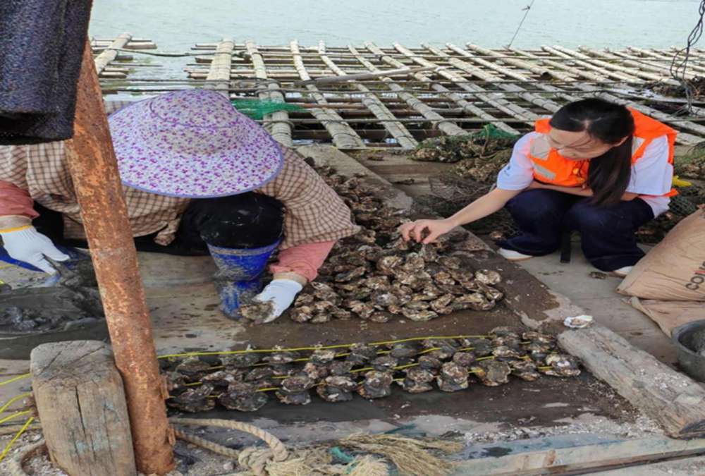 岭南师范学院飞跃鹰隼突击队队员与蚝农交流传统吊养技术 蔡锦儿 摄