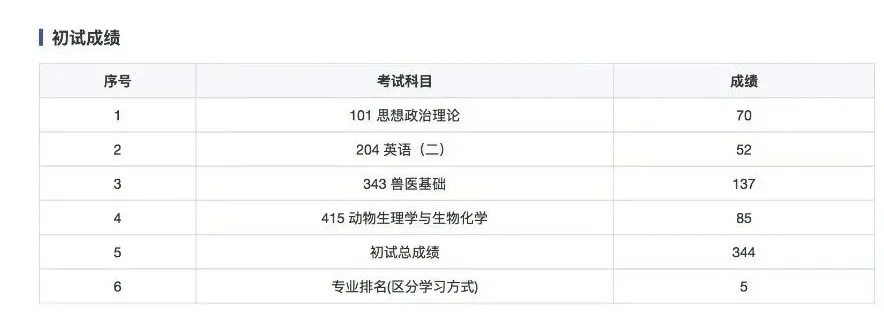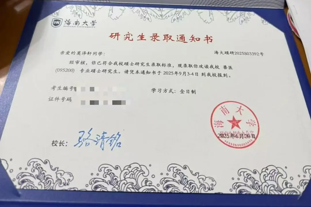莫泽轩的考研成绩终于尘埃落定:初试344分,复试79分,综合总成绩72.88分,在海南大学兽医专业录取名单里排到了第三名。这个跨专业学子,用实实在在的分数证明了努力的分量。