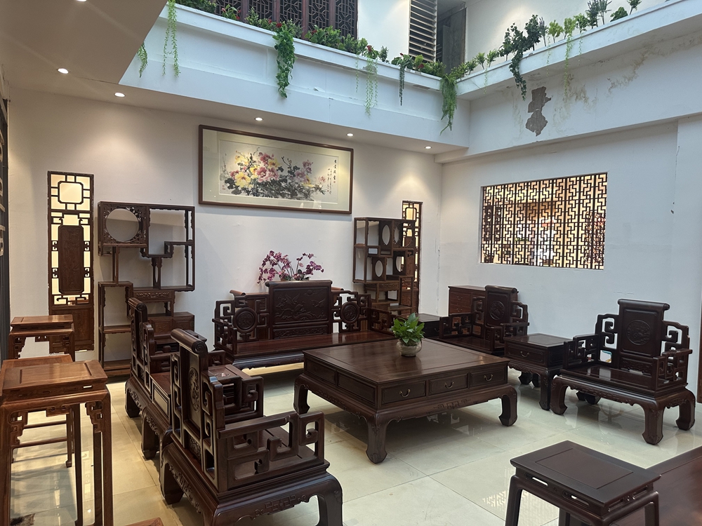 进入商铺,老板带领团队参观了一下其门店的红木展品,并且向团队介绍了大湾镇红木产业大概的发展历程,大湾镇素有“红木之乡”的美誉,其红木工艺生产可追溯至清朝末年,当时以小型作坊形式存在,主要从事红木工艺生产,奠定了当地红木产业的基础,直到20世纪80年代,大湾镇开始重新生产红木家具。目前,红木主要产品包括红木工艺品和成套的红木家具,不仅畅销国内市场,还远销欧美和港澳台地区。还详细介绍了红木产业核心优势在于工艺特色鲜明,榫卯技术精湛,不用一钉一铆,却能使家具结构稳固;雕刻技法多样,人物、花鸟、山水等图案栩栩如生。近三年来,产品结构也有所优化,工艺品和装饰品的占比逐渐提高。