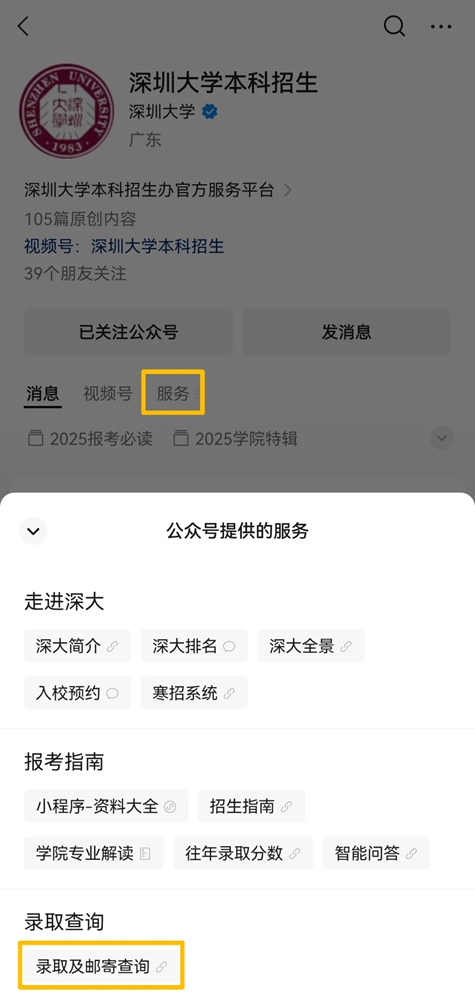 关注“深圳大学本科招生”公众号,点击“服务”菜单“录取及邮寄查询”。