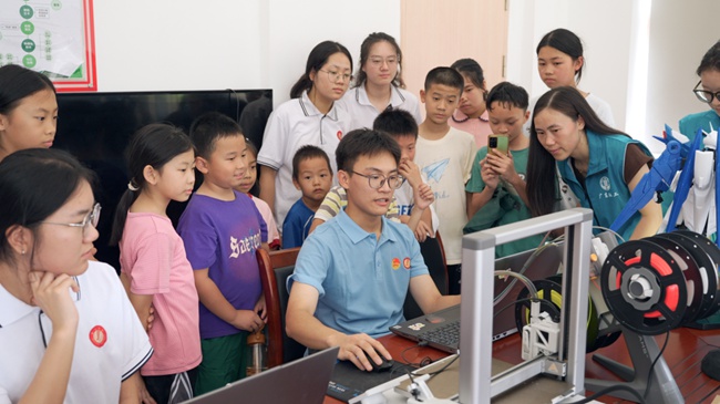 “姐姐,能不能教我做火箭的3D打印模型?”一个小男孩兴奋地说。一旁的3D打印机正在匀速运转,喷头吐出的材料层层堆叠,将数字模型一点点转化为立体实物。围观的孩子们纷纷踮起脚尖,专注地看着3D打印制作过程,期待着将自己的创意构想转化成现实。