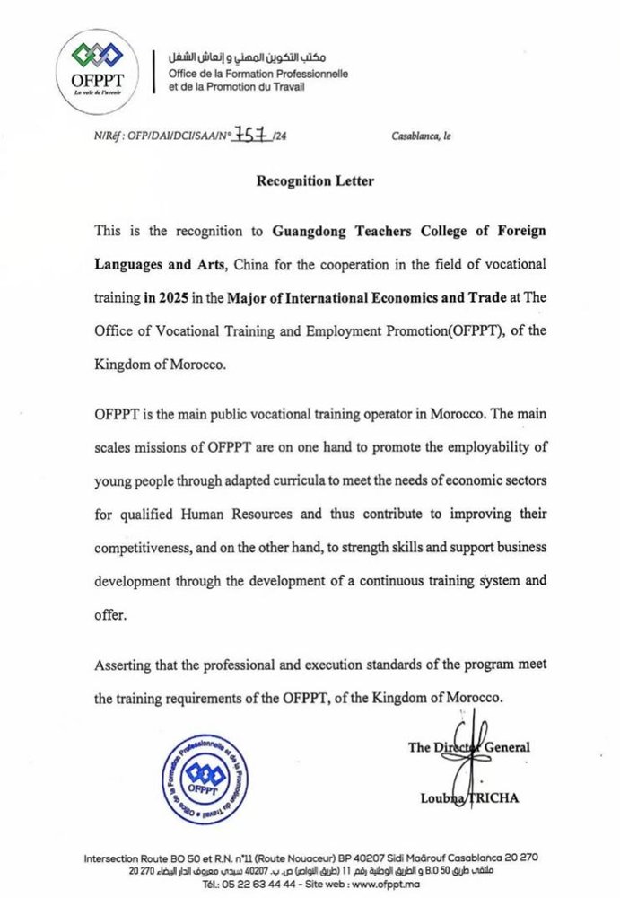图:广外艺国际经济与贸易专业标准获摩洛哥教育主管部门认证