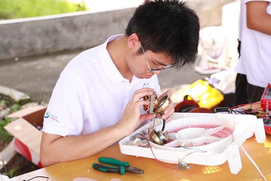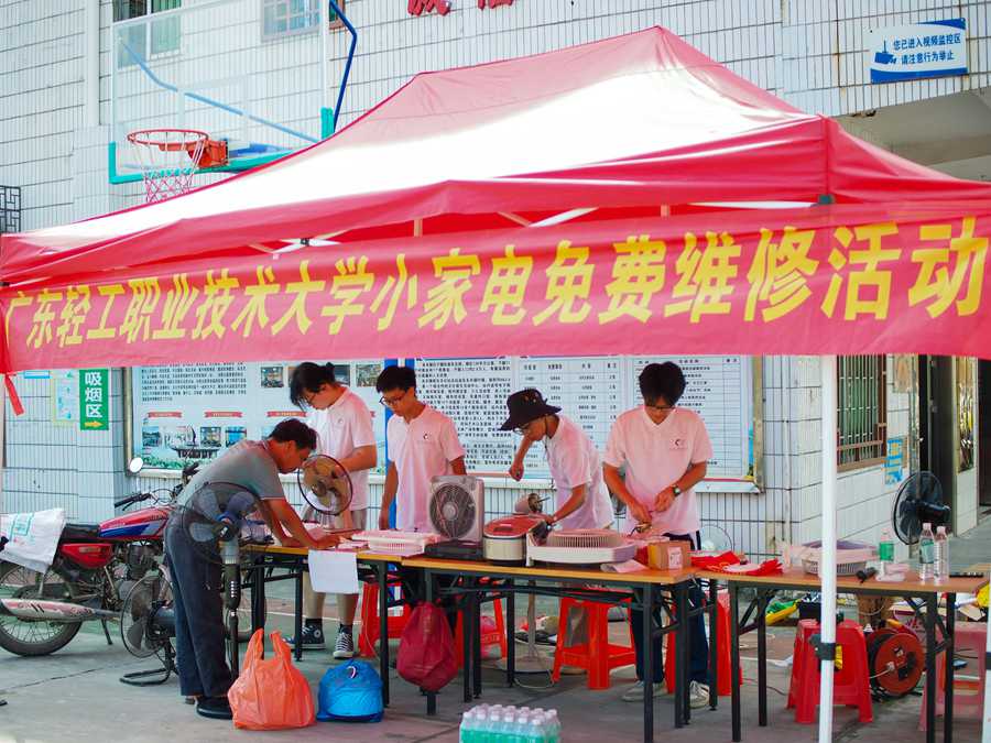 在永丰丰顺广场,一个简易却热闹的维修点格外引人注目。突击队员们熟练地拆解电器、检测电路、更换零件,不一会儿就让“罢工”的电风扇重新转动起来。“这些大学生真厉害!”捧着修好的电饭煲,村民王伯连连称赞,“去县城修要花上百元,他们分文不收就解决了。”