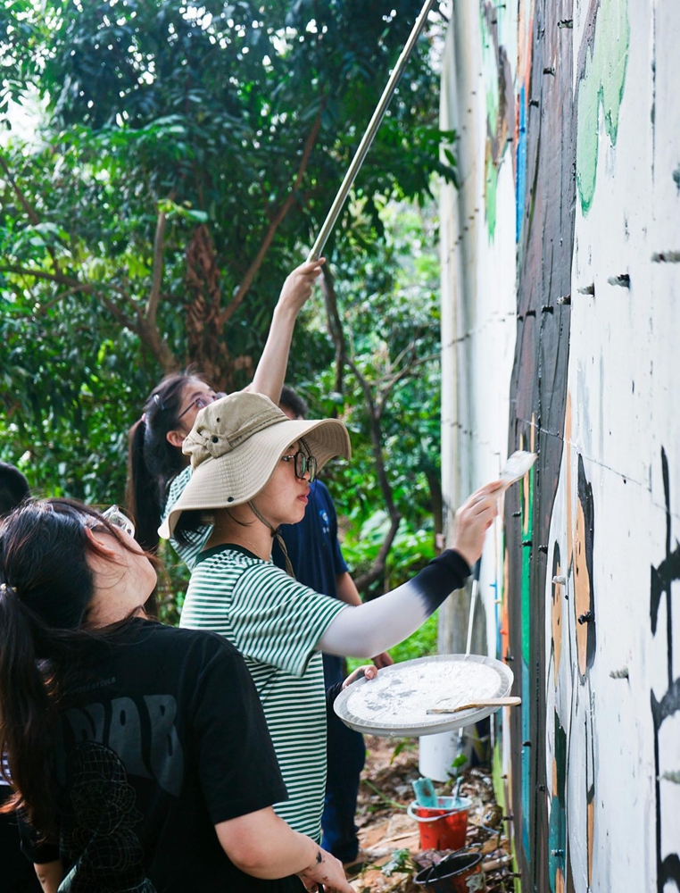 然而创作之路布满荆棘!墙绘场地处于陡峭斜坡,红土地泥泞松软,需与村民合力锄出落脚点;烈日炙烤下,红蚂蚁、红蜘蛛疯狂滋扰,每一笔都需在摇晃中保持平衡。但队员们以专业为笔、以热爱为墨,汗水浸透衣衫仍紧握画笔——手臂酸痛时彼此鼓劲,色彩偏差时共同调校,将文化敬畏融入每道线条。