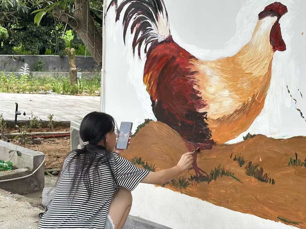 农庄外墙是创作重点:“国风公鸡图” 象征丰收,“大鹅图” 生动活泼,“田园全景图” 展现农庄风光,“鱼趣图” 寓意吉祥。