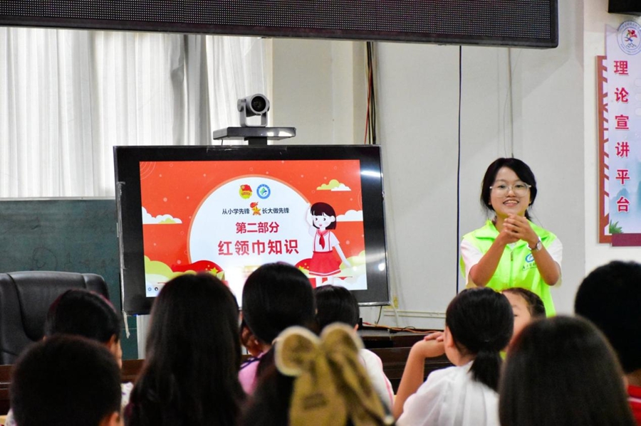“王二小是我们所有人的榜样,少先队员就是要像他这样,勇敢、有担当,心里装着大家。”说到这里,大学生志愿者们将红领巾轻轻系在小朋友们的颈上,此时“少先队员”不再只是一个称号。