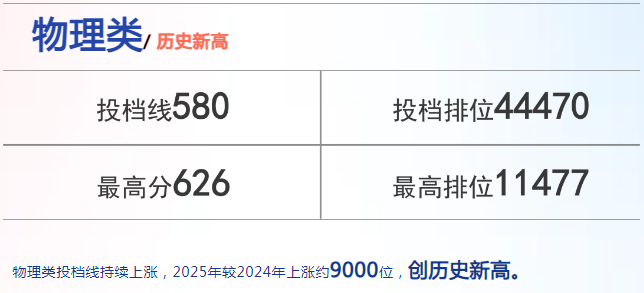 物理类投档线持续上涨,2025年较2024年上涨约9000位,创历史新高。