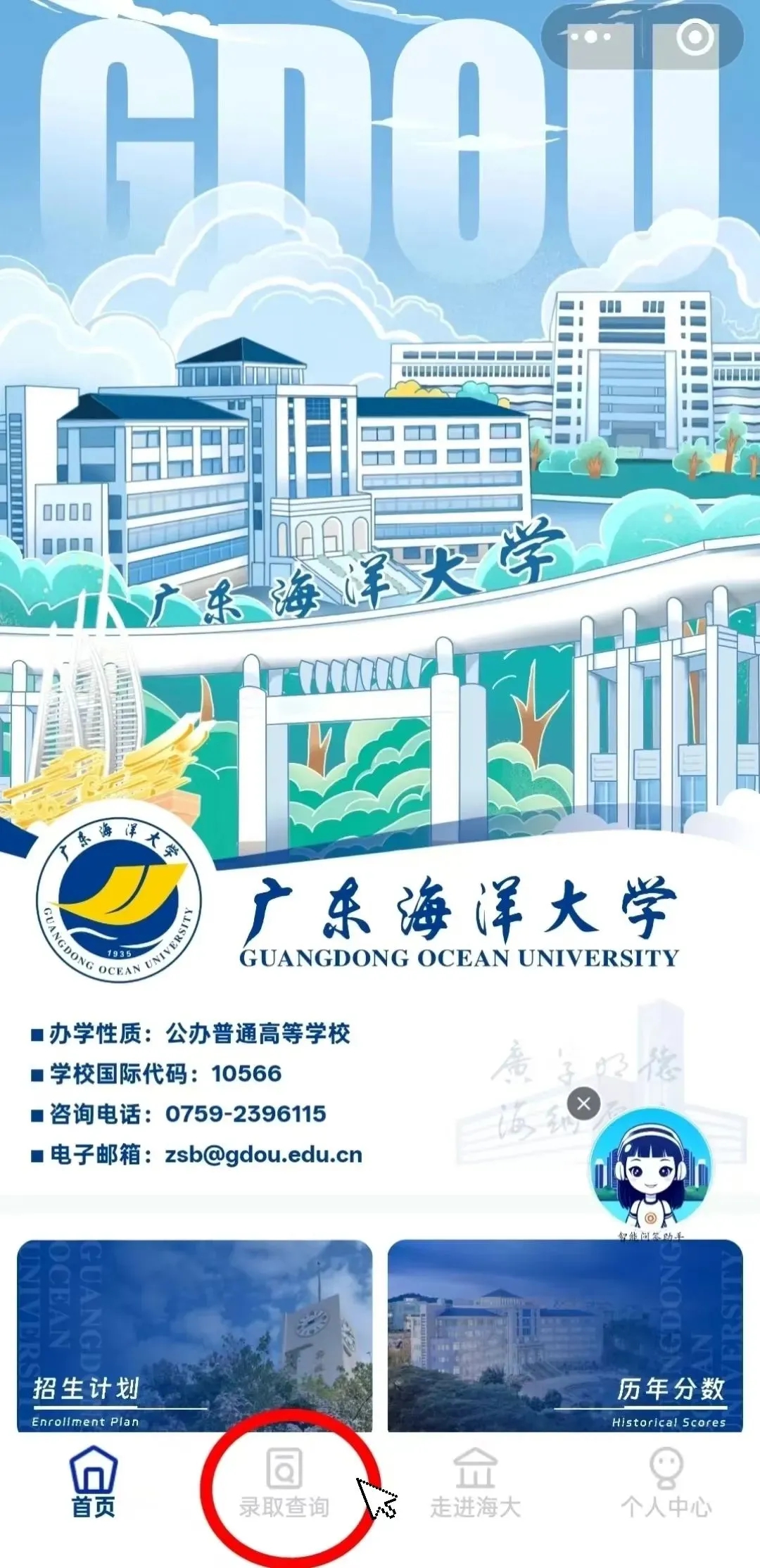 通过“广东海洋大学招生办公室”微信小程序,进入录取查询页面进行查询。