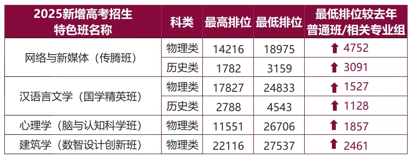 深圳大学设有33个特色实验班,今年依旧受到考生的青睐。特色班录取排位普遍显著高于相关普通班,物理类平均高出3035位,历史类平均高出2218位。