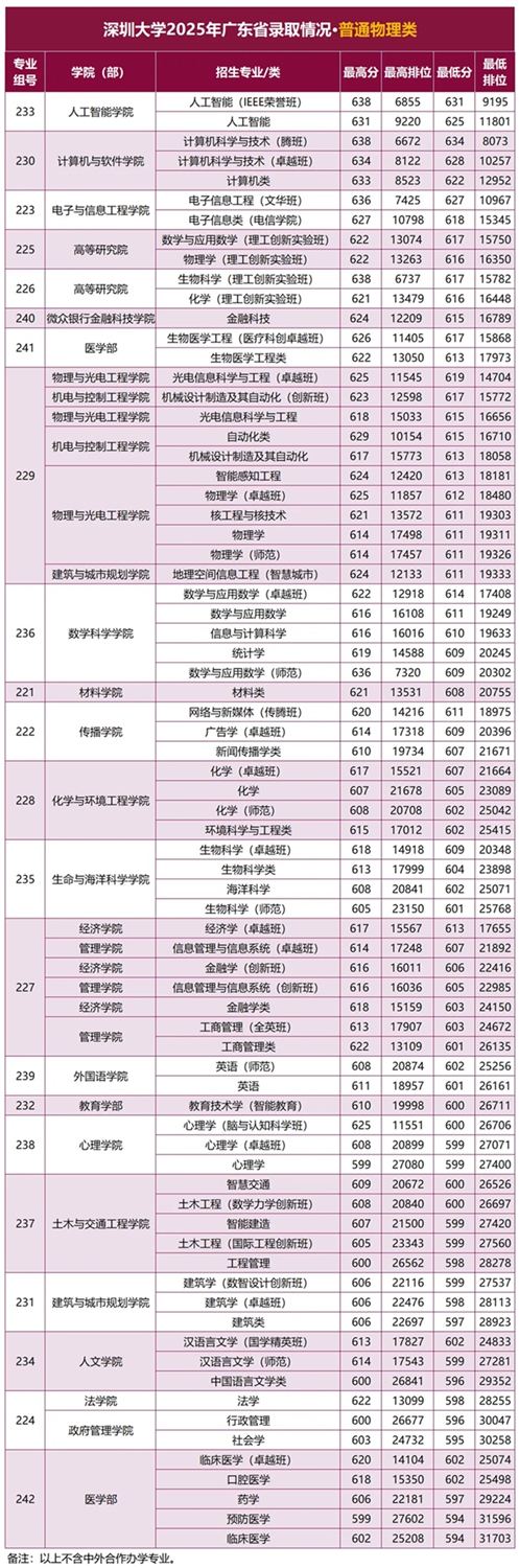 深圳大学2025年新设立的人工智能学院,设有两个本科招生专业:人工智能(IEEE荣誉班)、人工智能,在广东省物理类单设专业组(233专业组)招生。该专业组最低录取排位居我校广东省物理类专业组首位。