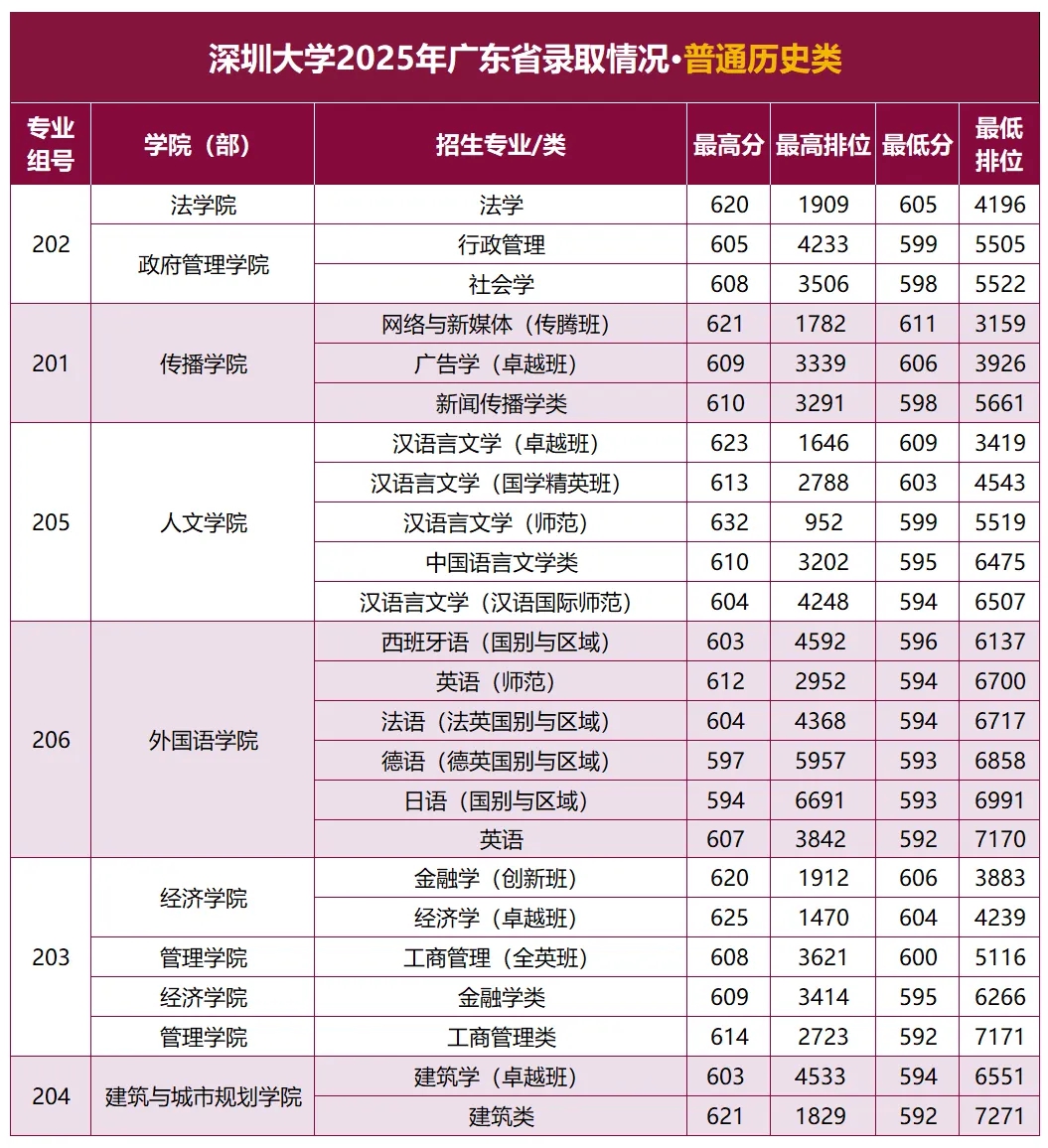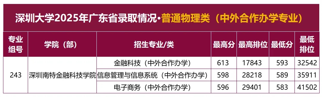 深圳大学2025年广东省专业组分组较细(基本以学院为单位),物理类及历史类整体专业志愿满足率超96%。