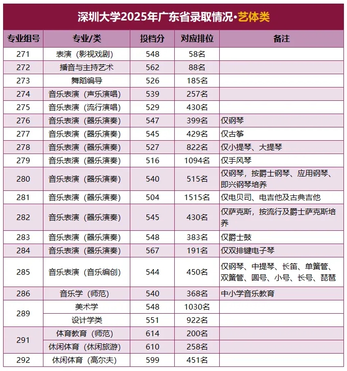 深圳大学2025年广东艺术、体育类大部分专业录取排位均有提升,部分专业组情况如下: