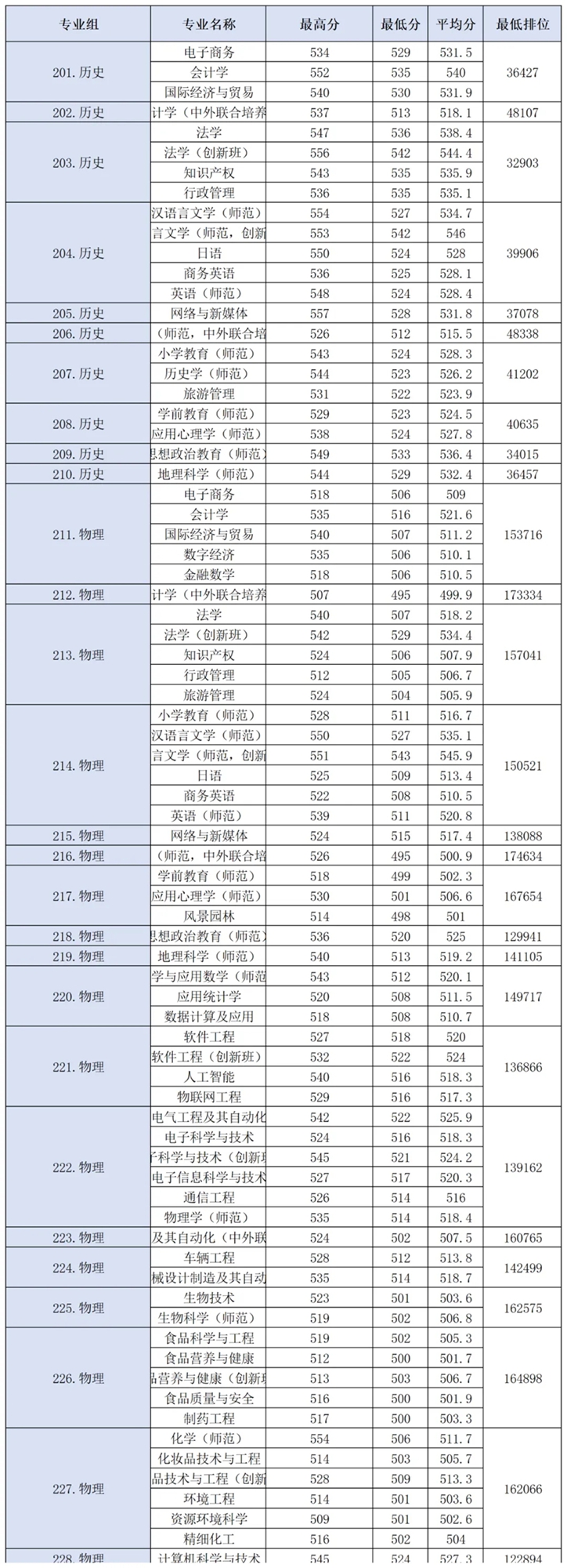 1.历史类有所提升:历史类专业最高分为557分,最低分为522分,比去年提高23分,最低排位为41202名。历史201组经管类、203组法学类和205组新文科类的专业录取分数有提升,最低录取排位较去年提升约3000名,进步显著。