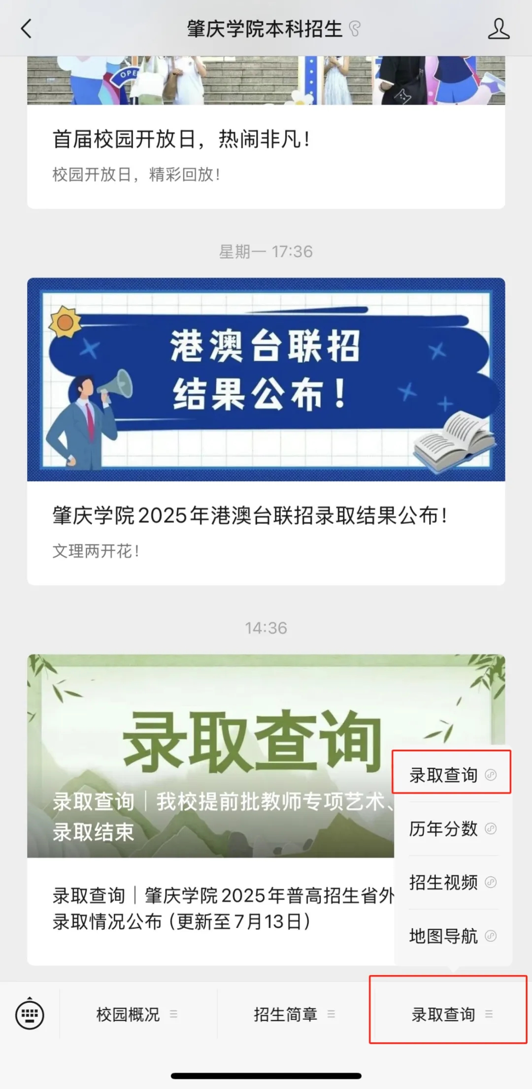 考生可关注“肇庆学院本科招生”微信公众号,点击“录取查询”进入查询页面,输入考生姓名、考生号、身份证号进行查询。