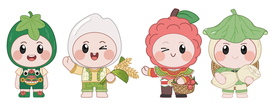鳌江镇素有“冬瓜之乡”“莲藕之乡”的美誉,荔枝、大米等农产品亦品质优异。在帮扶工作队前期调研的基础上,突击队成员充分讨论研究,以“一村一品”为切入点,提炼出“鳌江四宝”——冬瓜、莲藕、荔枝、大米四大特色农产品,并设计出兼具地域文化与现代审美的IP形象。IP形象设计深度挖掘当地特色农产品特征,并巧妙融入揭阳青狮、潮汕嵌瓷、潮剧、惠来渔歌等非遗元素,进一步赋予“四宝”独特的文化魅力,并显著增强了其视觉识别度。