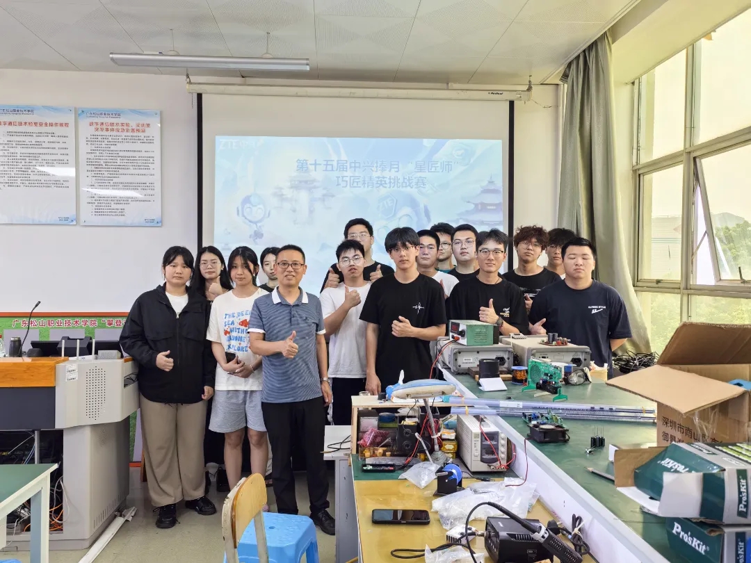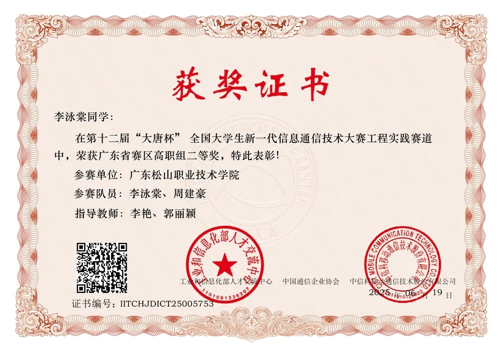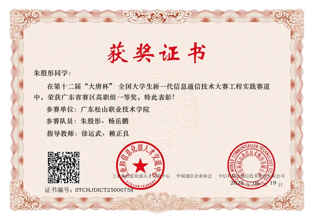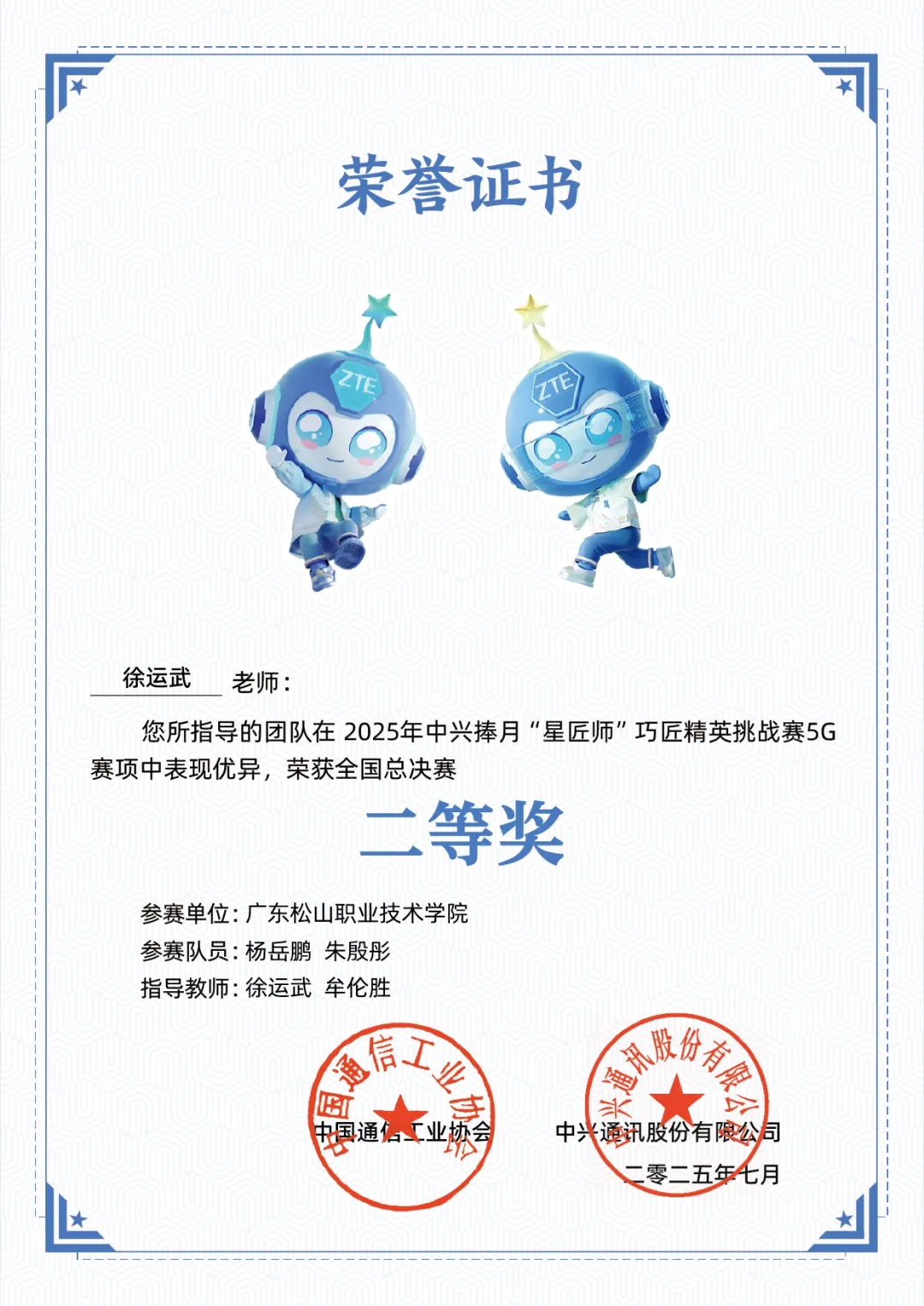 2025年盛夏,广东松山职业技术学院电气工程学院师生又双叒叕捧回国赛大奖!在第十二届“大唐杯”全国大学生新一代信息通信技术大赛全国总决赛中,广东松山职业技术学院师生团队斩获“工程实践赛”高职组一等奖;同期举行的第九届全国大学生网络与信息技术分区赛上,又以一等奖1项、三等奖5项的战绩续写辉煌;在第十五届中兴捧月“星匠师”巧匠精英挑战赛全国总决赛中,该团队勇夺“5G赛项”全国总决赛二等奖,徐运武老师在“AI实训教学创新设计”赛项斩获三等奖。