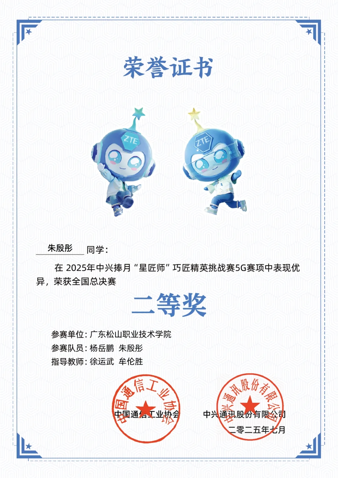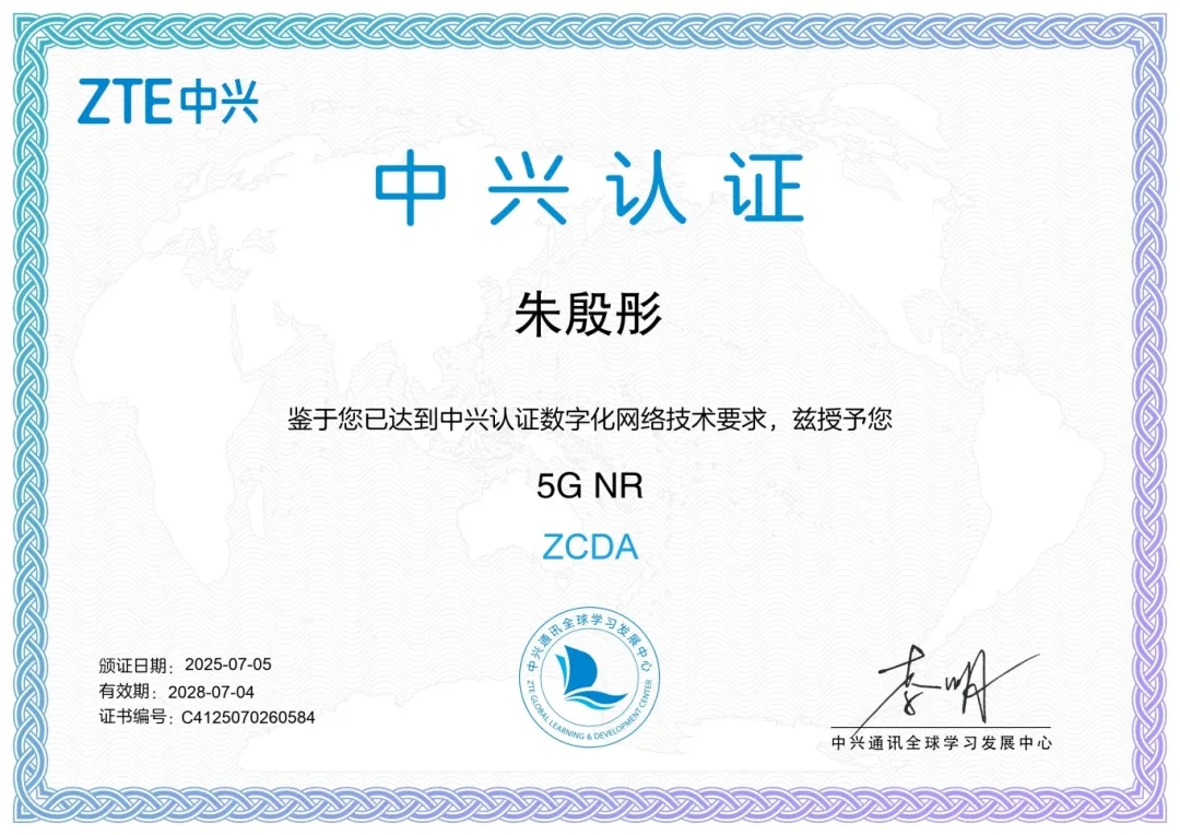 目前,杨岳鹏、朱殷彤两位同学在第十五届中兴捧月“星匠师”赛事中,均达5G NR ZCDA标准,获中兴认证。