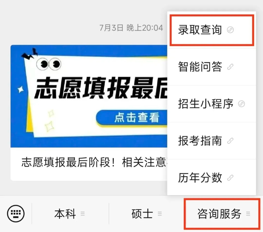 考生可进入广东财经大学“广东财经大学招生考试处”微信公众号,点击“咨询服务”——“录取查询”,进入录取查询页面。