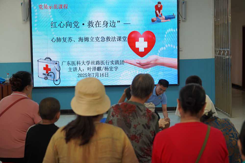 在屯垦历史博物馆,队员们从军垦战士用过的医药箱里读懂“医者仁心”;在50团团史馆,听着讲解员含泪讲述余汉成坚守边疆42年的行医故事、张耀华照顾病妻的感人事迹,以及各族职工共垦盐碱地的团结往事等,实践团成员深切感受到“扎根边疆、团结奉献”的精神内核;在唐王城千年屯垦文化体验中心,实践团用AI重现兵团人在戈壁荒漠上兴建家园,用青春和热血开创共和国屯垦戍边伟业的历史画面;在50团医院,研究生党员为当地医护讲授房颤科普及体重管理党员示范课程;在社区,队员们耐心地手把手指导心肺复苏和海姆立克急救,老老小小都踊跃参加。头发花白的爷爷奶奶,认真学着按压的动作,大眼睛长睫毛的小男孩有模有样地数着“01、02、03……”,维吾尔族大妈边看边比画,时不时用方言交流几句,旁边上班的社区工作者也加入了学习的行列。