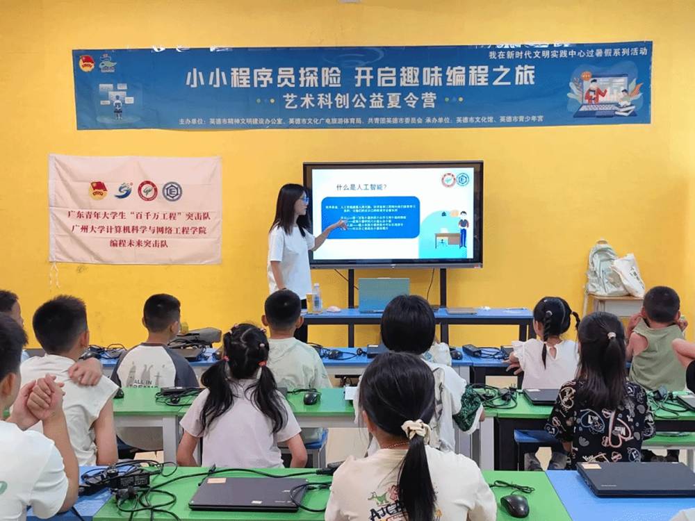“灵眸智译”突击队还联合英德市团委、英德市委宣传部打造“艺术科创公益夏令营”。此次夏令营为在英德工作生活满3个月的新就业形态劳动者(包括快递员、网约配送员、网约车司机、货车司机、网络主播、网约家政、社交电商从业者等)子女量身定制,为孩子们带来了一场“零门槛”的科技探索之旅。在人工智能启蒙课程中,突击队成员通过“神经网络小游戏”“人脸识别现场训练”“手语数字人”等活动,让孩子在互动中真切体会到科技如何改变生活以及人工智能如何让科技变得更有温度;编程实践课则从Python语言学习着手,除了让孩子们掌握循环语句、逻辑判断等基本语法知识,还通过其自身实践制作出乘法检验器、猜数字游戏等饶有趣味的小作品,激发孩子们科技探索的兴趣;在Scratch非遗编程课上,团队成员指导孩子们用代码还原英德红茶的非遗工艺,让本土非遗在数字世界焕发新活力。