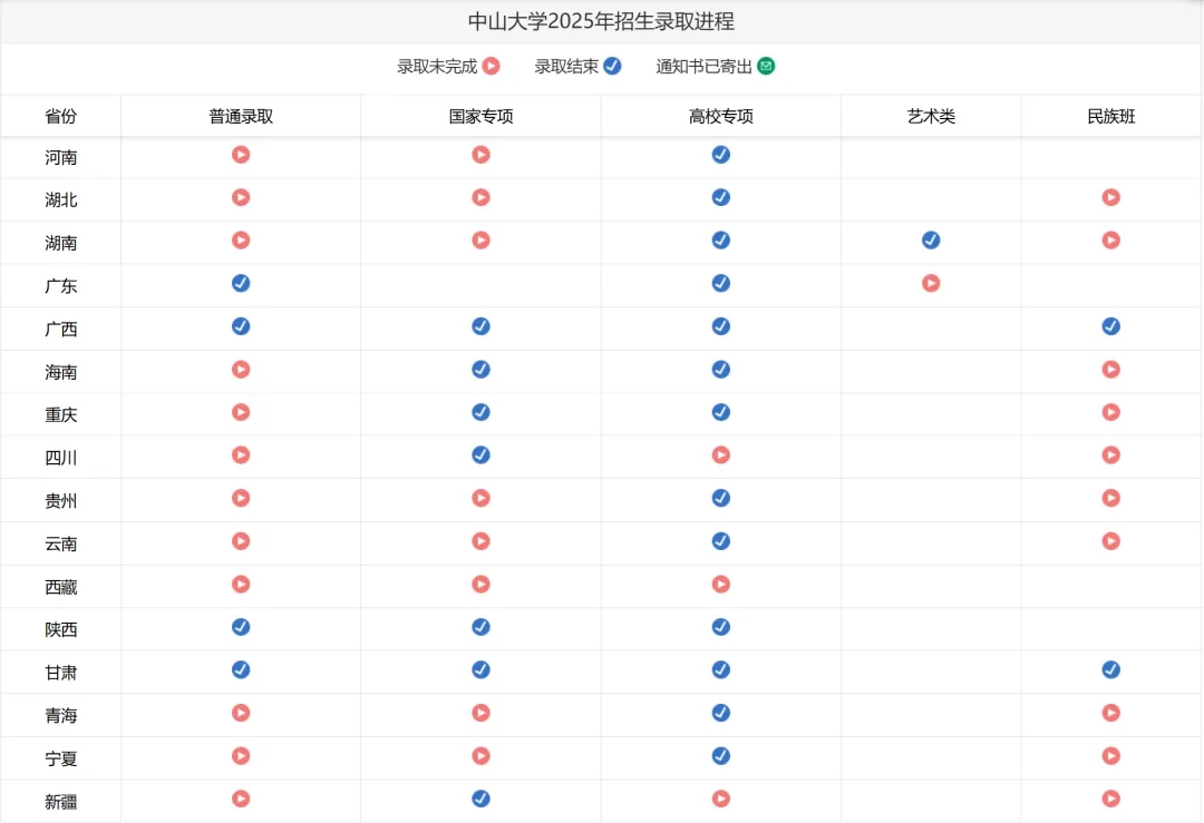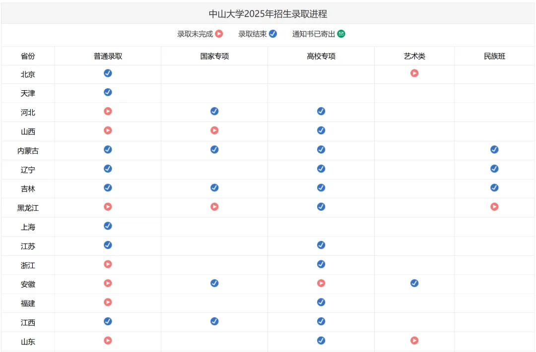 北京、甘肃、广东、广西、吉林、江苏、江西、辽宁、陕西、上海、天津等省份已经完成普通批录取和新生数据导入工作,部分省份的国家专项、高校专项、民族班等类型也已经完成录取工作,请考生查看以下中大本科招生网的录取进程页面。